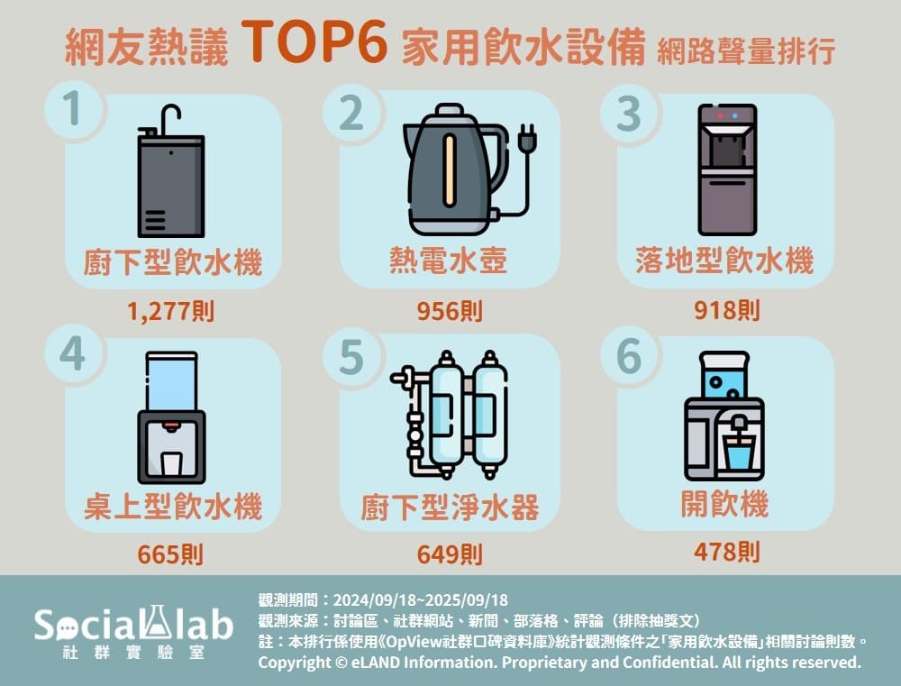 ▲ 網友熱議 TOP6 家用飲水設備 網路聲量排行