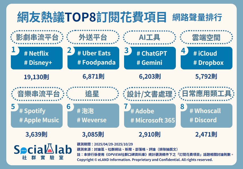 ▲ 網友熱議TOP8訂閱花費項目 網路聲量排行