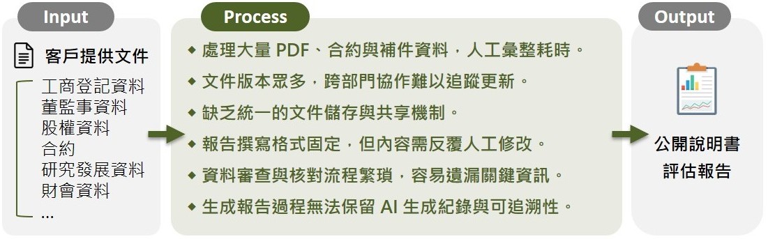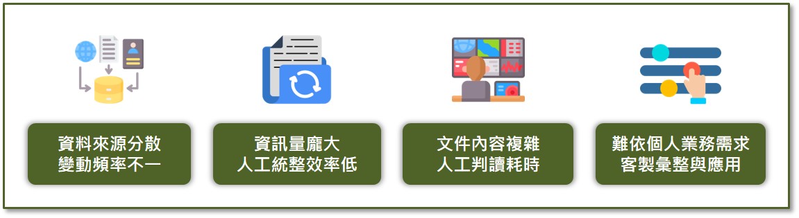 在此市場環境下,「客戶需求」也快速演變,愈來愈重視即時資訊、精準風險控管與客製化建議,傳統以人工為主的作業流程較難以有效滿足此類高頻多變的需求。另一方面,為了提供完整的投研或風控判斷,過往需投入大量時間蒐集與彙整資訊,卻因「資料來源」龐雜且分散,逐漸形成資訊過載問題,使分析效率顯著下降。