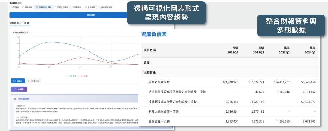 在投資情報方面,平台能串接多期財務數據,並自動生成可視化圖表,協助研究人員快速掌握企業經營趨勢與市場脈動,提升研究分析效率與判斷精準度。