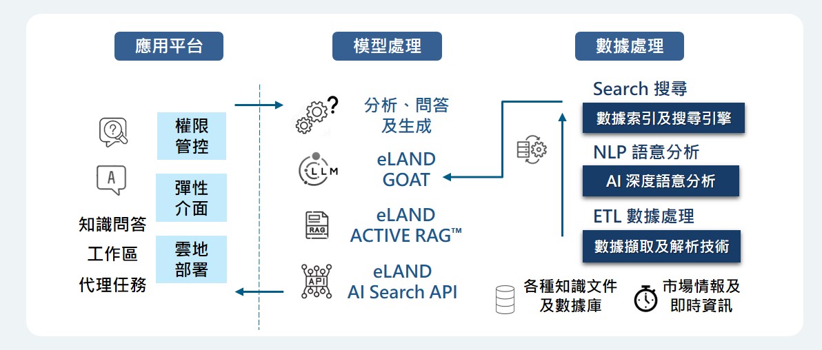 然而,金融業在導入 AI 技術時,必須同時符合「可信賴、可追溯、可驗證」等嚴謹要求,確保模型運作安全、資料來源透明,才能在合法合規的監理框架下真正落地。基於此,意藍結合搜尋引擎、語意分析與生成式 AI 之核心技術,從數據處理、模型處理到應用平台,建構出完整的 AI 落地應用藍圖 — AI Search 智能搜尋,協助金融機構大幅提升作業順暢度與決策品質。