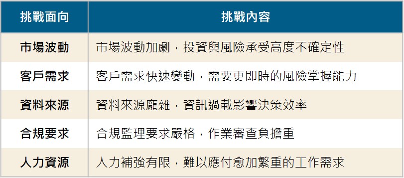 近年全球經濟局勢快速變化,加上科技加速演進,使金融業的營運環境愈發複雜。除了需持續因應外部的市場波動與新技術衝擊外,內部也承受監理要求升級與營運成本上升的壓力,整體轉型挑戰明顯加劇。下表將金融機構面臨的主要挑戰歸納為五項: