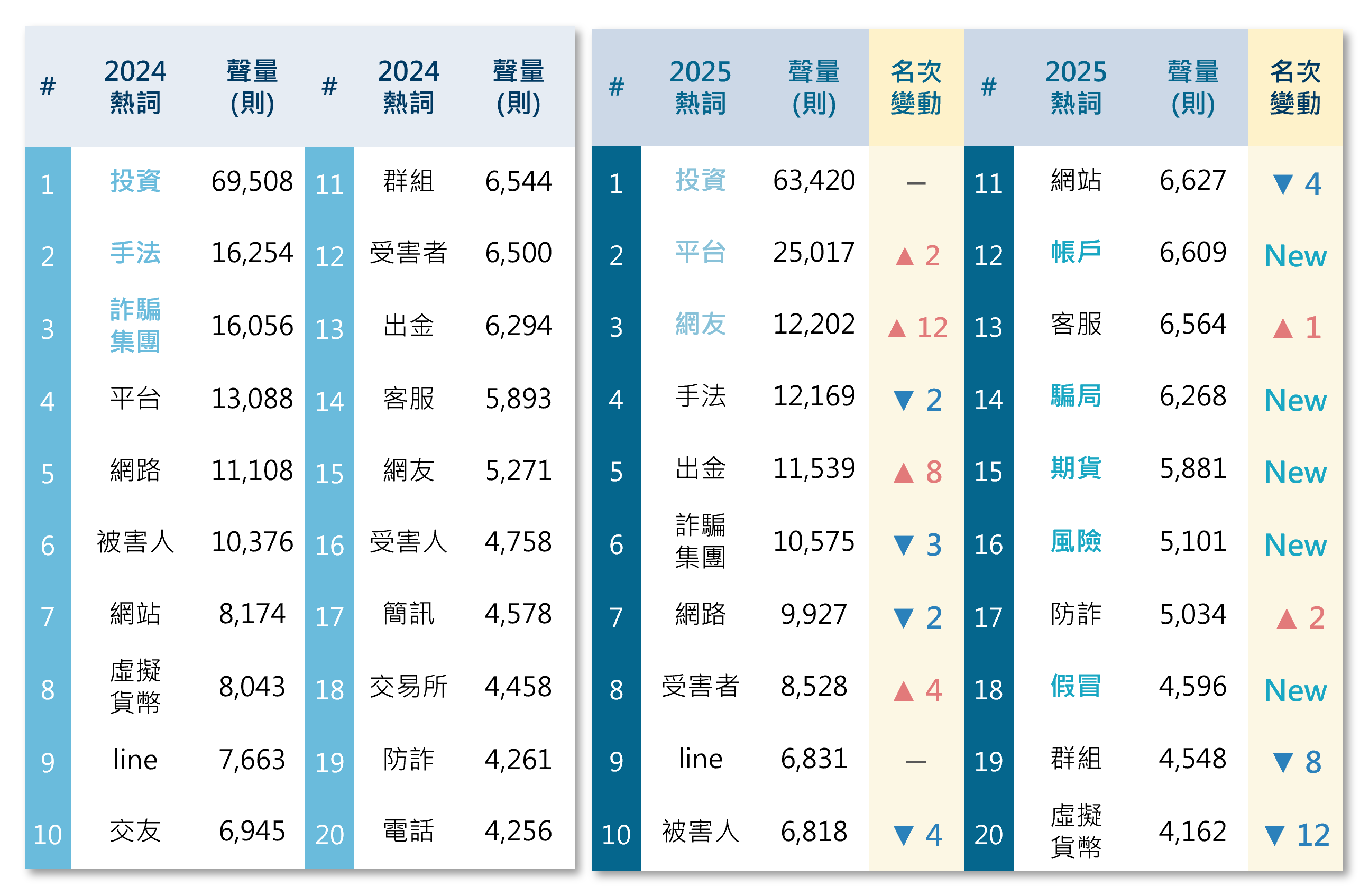 ▲詐騙話題 2025 與 2024 百大熱詞 TOP20​​