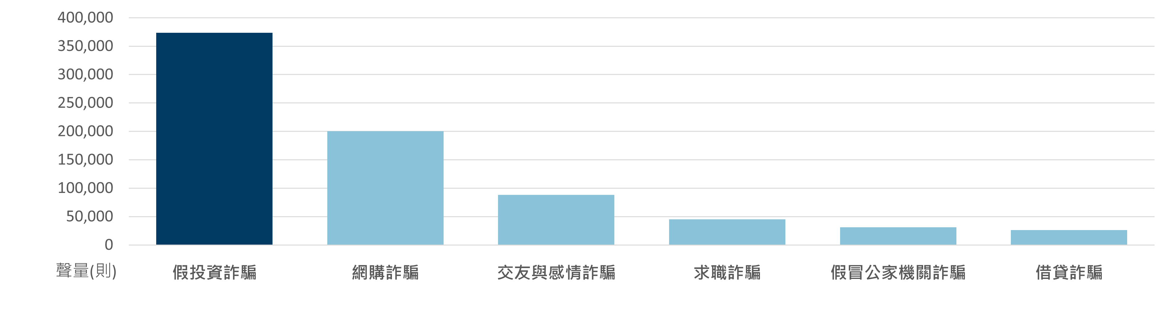 • 詐騙型態排行:假投資詐騙聲量排名第一,網友關注詐騙集團的行騙方式;網購詐騙則次之,詐騙集團藉由模仿完整購物流程的手法,降低民眾戒心並誘導其落入陷阱。