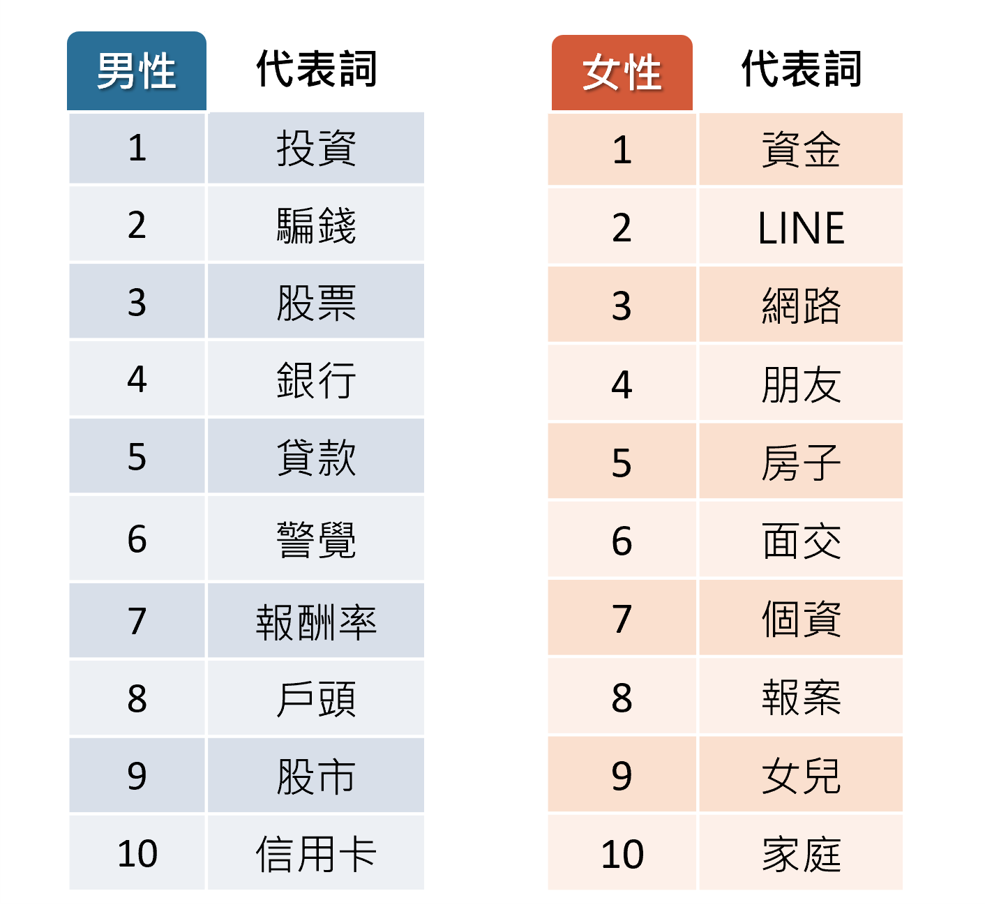 接著分析參與話題討論的族群,從上圖可發現「男性」與「上班族」是詐騙話題的主要關注者。由於上班族多具備穩定收入,且日常多需頻繁使用金融服務與通訊工具,話題參與度明顯高於學生族群。進一步自兩性角度切入,透過代表詞註2瞭解男女之間的關注面向差異,發現男性族群的討論集中於「金融工具、投資機制與獲利」,包括投資、股票、銀行與報酬率等,反映其更在意詐騙如何透過專業包裝、高報酬話術與複雜機制,引導民眾做出錯誤的判斷。相較之下,女性討論則多圍繞「接觸管道與生活情境」,如 LINE、網路或面交等,並延伸至女兒、家庭等詞彙,反映女性更關心詐騙如何滲入日常生活,以及受騙後需承擔的後果對家庭關係的影響。