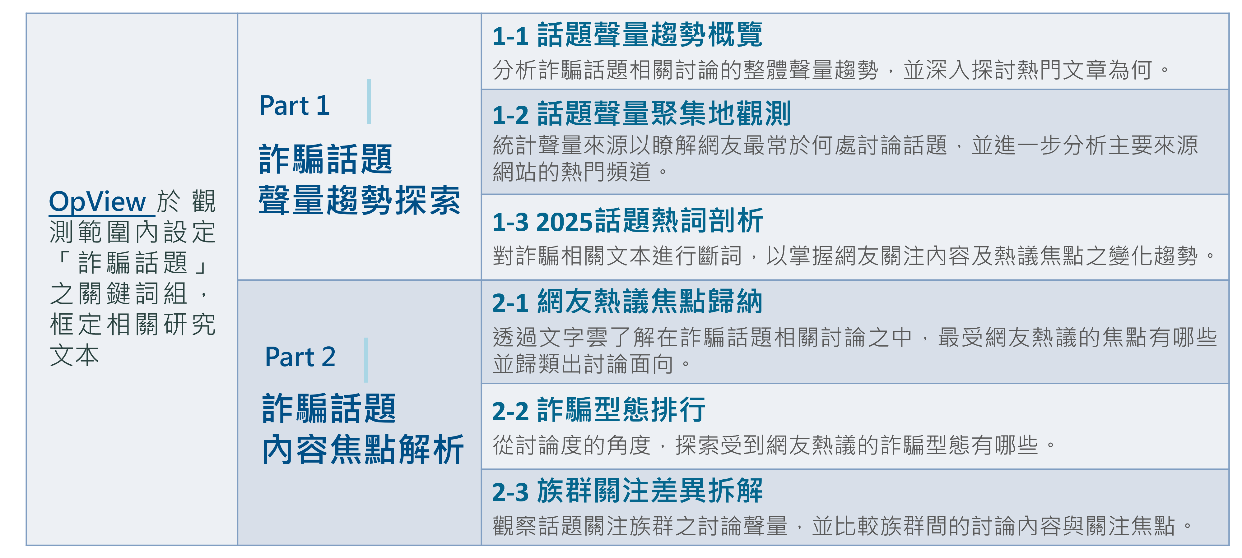 • 網友熱議焦點:詐騙相關討論橫跨「詐騙型態」、「詐騙話術」、「角色身分」與「詐騙防制」四大面向,不少網友除揭露詐騙經驗外,也主動查證與分享防詐資訊,防範其他民眾受騙上當。
