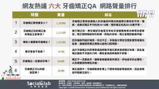 ▲ 網友熱議TOP6牙齒矯正QA 網路聲量排行