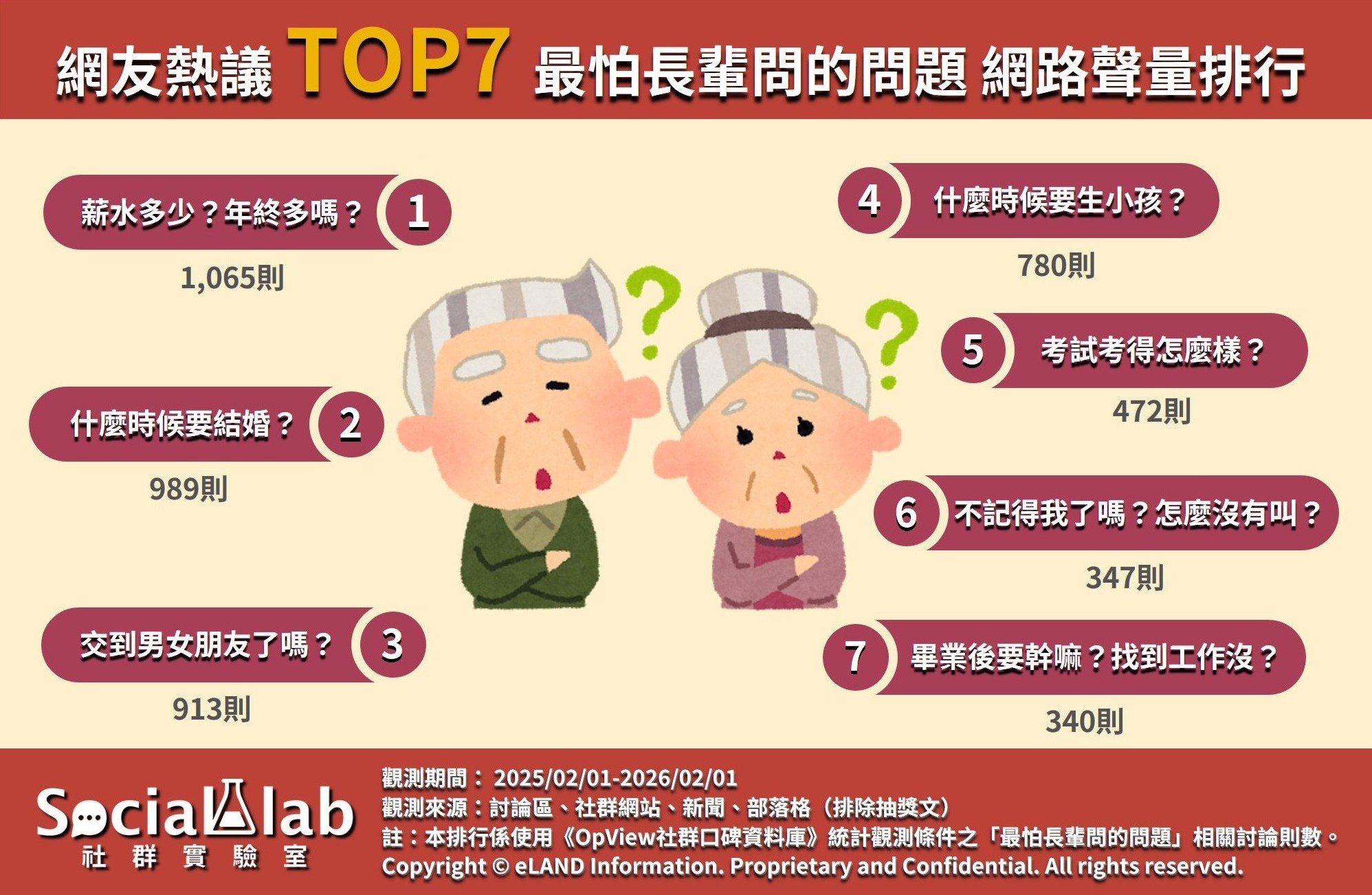 《Social Lab社群實驗室》本次透過《OpView社群口碑資料庫》追蹤近一年「最怕長輩問的問題」相關話題的網路聲量,帶您了解網友熱議的七大最怕長輩問的問題有哪些。