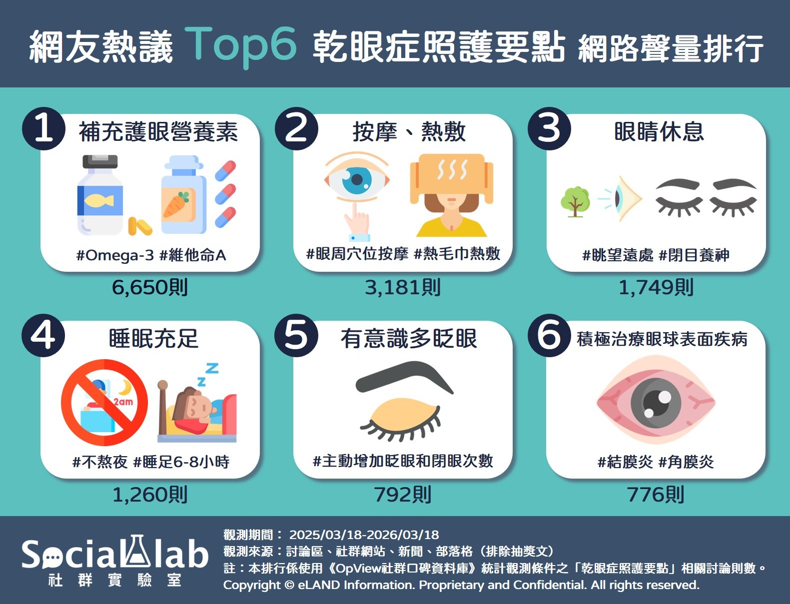 《Social Lab社群實驗室》本次透過《OpView社群口碑資料庫》追蹤近一年「乾眼症照護要點」相關話題的網路聲量,帶您了解網友熱議的六大乾眼症照護要點有哪些。
